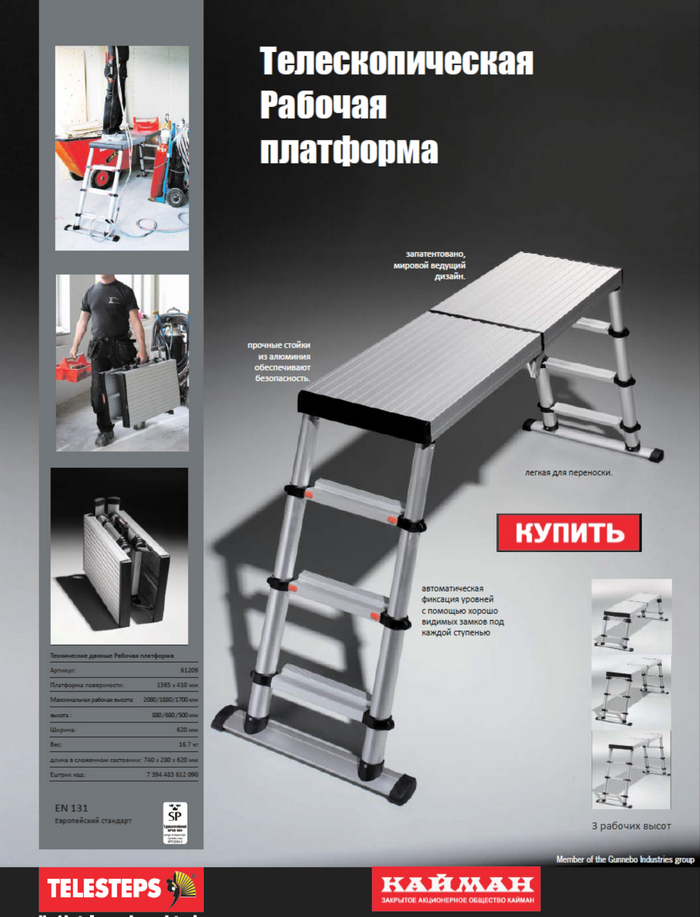 Телескопическая лестница-стремянка Telesteps (Швеция) Длина в разложенном виде: 1.7м, 2.3м и 3.0м. Сочетание в одном продукте обычной лестницы и стремянки. Свободно стоящая лестница-стремянка имеет две дополнительные ступени, позволяющие комфортно и безопасно работать на высоте. Простым действием лестница-стр… Читать дальшеемянка может быть преобразована в обычную лестницу, прислонённую к стене. Одна лестница-стремянка вместо двух разных по типу лестниц — вот в чём преимущество! Наше качество – Ваша безопасность Полный каталог продукции на: http://telesteps.su/?page_id=4 Россия, 620042, Екатеринбург, ул. Ломоносова, д. 55 Б, офис 14, тел./факс: (343) 382-69-10, 381-59-97 E-mail: ural@kaiman.ru